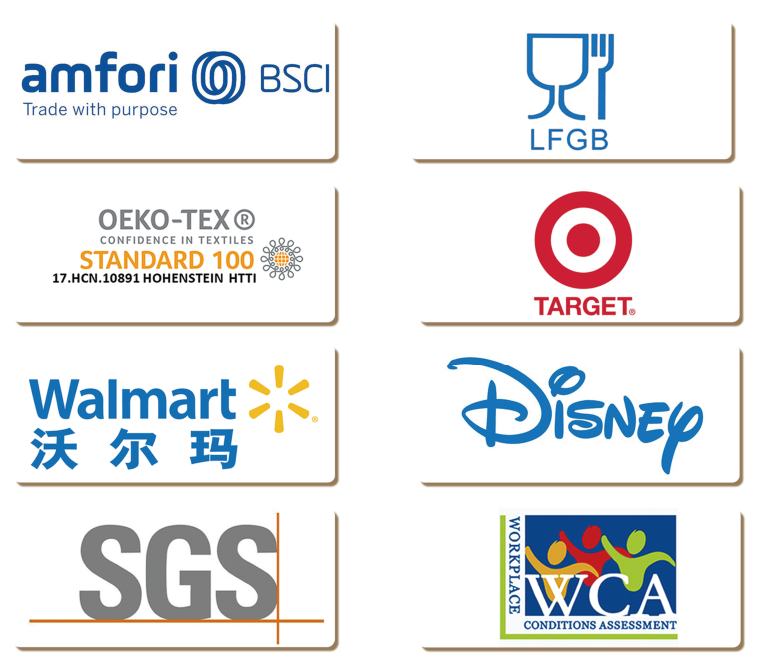 公司視產(chǎn)品質(zhì)量如生命,始終堅持“以創(chuàng)新誠信求生存,以品種質(zhì)量謀發(fā)展”的質(zhì)量方針。公司先后通過ISO9001:2015質(zhì)量管理體系認(rèn)證、ISO14001:2015環(huán)境管理體系認(rèn)證和知識產(chǎn)權(quán)管理認(rèn)證;通過美國沃爾瑪驗廠、迪士尼驗廠、塔吉特驗廠及歐盟BSCI認(rèn)證;產(chǎn)品通過歐洲Oeko-Tex standard 100生態(tài)紡織品1類(嬰幼兒)產(chǎn)品認(rèn)證、WCA、SQP認(rèn)證;產(chǎn)品通過SGS檢測及BV檢測,未發(fā)現(xiàn)增塑劑、雙酚A、福爾馬林等有害物質(zhì);有害重金屬及有害物質(zhì)符合歐盟EN 71玩具安全標(biāo)準(zhǔn),符合美國ASTM F963玩具標(biāo)準(zhǔn);產(chǎn)品材料符合德國LFGB食品接觸材料管理法、歐盟Reach法規(guī)、ROHS指令的相關(guān)環(huán)保標(biāo)準(zhǔn);抗靜電性能符合歐盟EN 1149抗靜電檢測標(biāo)準(zhǔn)。